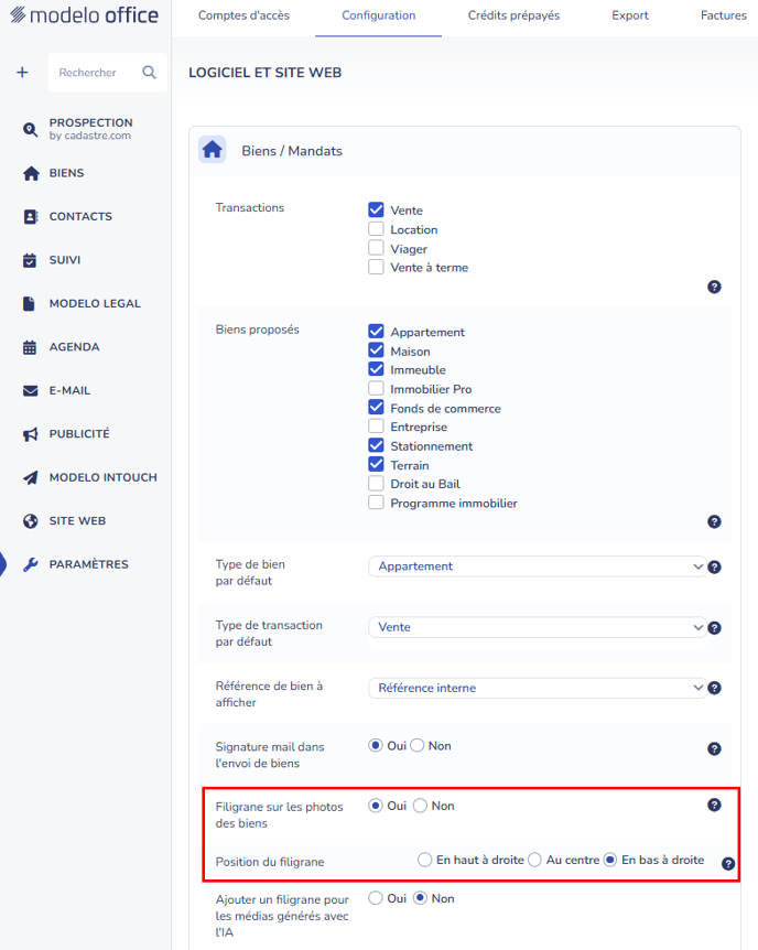 - Cochez "Oui" au niveau du champ "Filigrane sur les photos des biens".
