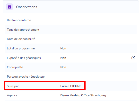 Pour savoir qui à la charge d'un bien, vous pouvez le voir dans la fiche du bien dans le bloc "Observations", champ "Suivi par".