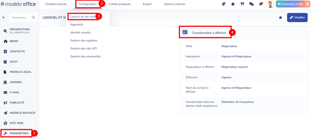 Selon la configuration choisie pour votre agence dans Paramètres > Configuration > Logiciel et site web, bloc "Coordonnées à afficher".