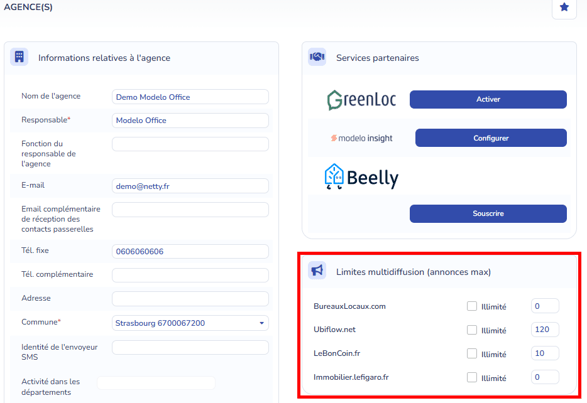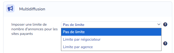 - Limite par agence : Il vous sera possible de configurer une limite de diffusion par site marchand au global, pour tous les négociateurs de votre agence.