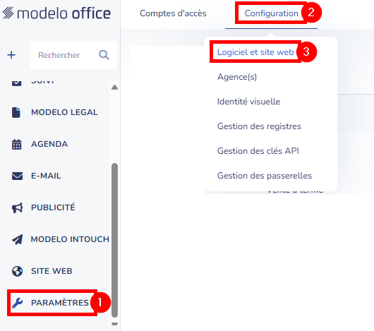 1. Rendez-vous dans l'onglet PARAMÈTRES [1] > Configuration [2] > Logiciel et site web [3]:
