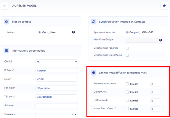- Limite par négociateur : Il est possible de configurer une limite de diffusion sur le profil de chacun de vos négociateurs.