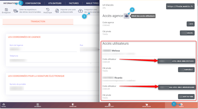 2. Récupérez le code agence et de la clé privée (dans le carré gris) :