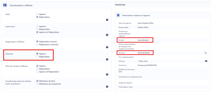 Le paramétrage s’applique aux deux : soit on transmet les coordonnées du négociateur (email + téléphone), soit celles de l’agence (email + téléphone).
