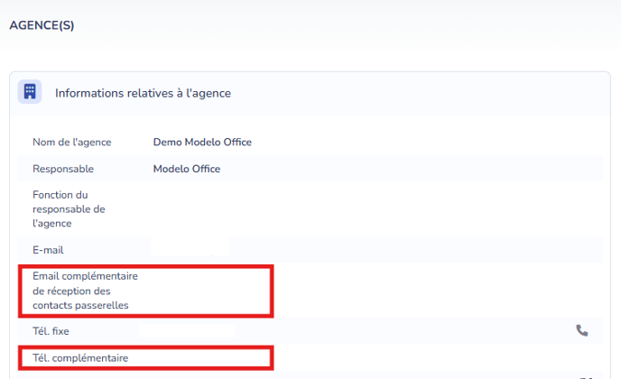Si vous souhaitez recevoir les contacts passerelles sur une autre adresse email ou un autre numéro de téléphone supplémentaire, il suffit de renseigner ces informations dans la page Agence :