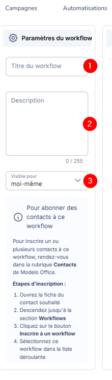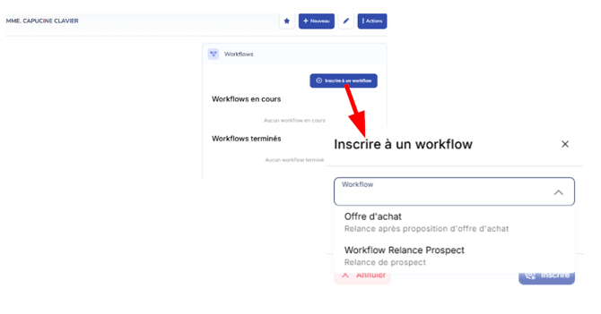 Avant qu’un scénario ne démarre, il faut inscrire un contact dans le workflow depuis sa fiche contact dans Modelo Office.