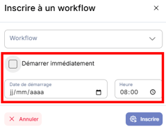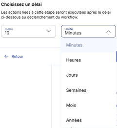 Le délai indique “quand” l’étape doit être exécutée après l’inscription du contact au workflow. Concrètement, c’est vous qui décidez quand le scénario doit commencer :