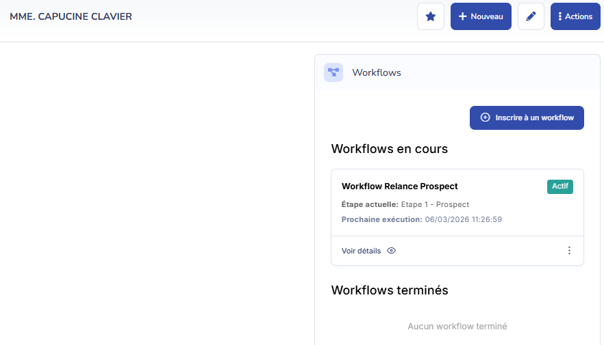 Dès que l'inscription est validée, le workflow apparaît dans la fiche du contact, dans la section Workflows en cours.