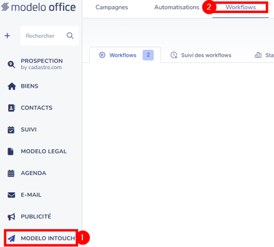 1. Cliquer sur Modelo Intouch [1] dans le menu de gauche puis sur Workflows [2].