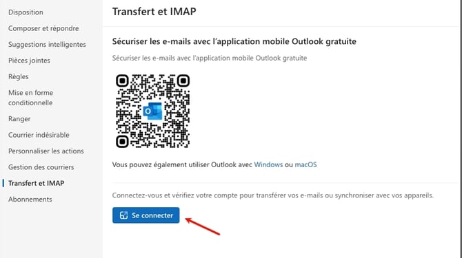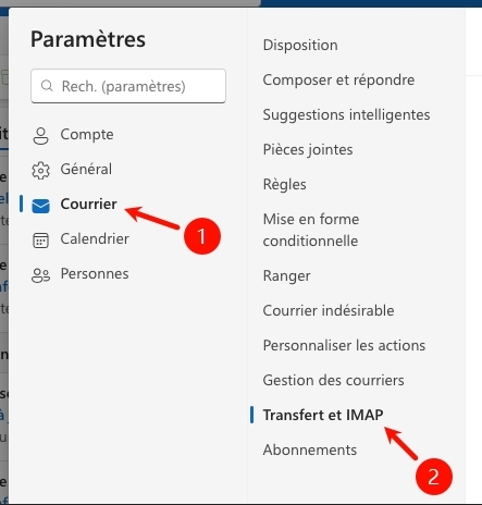 3. Rendez-vous dans le menu Courrier puis Transfert et IMAP
