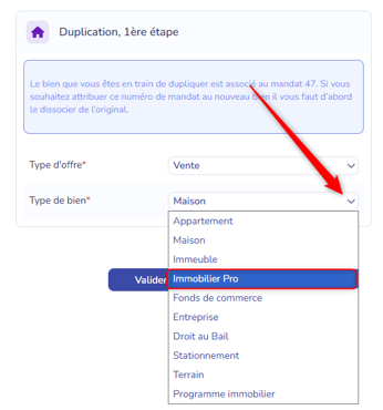 - Après avoir cliqué sur l'action de "Dupliquer le bien", le logiciel vous redirigera sur la page de création du bien vous permettant de changer le type de bien.