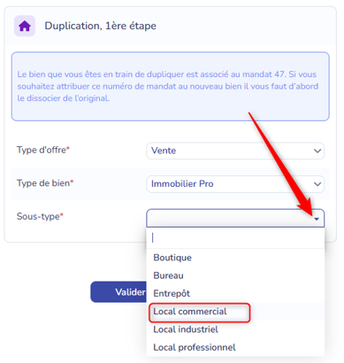 - Exemple d'un client qui soit dupliquer sa fiche initiale en type de bien "Maison" en "Local commerciale" :