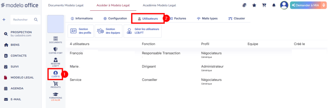 1. Allez dans MODELO LEGAL > Accéder à Modelo Legal puis Compte [1] > Utilisateurs [2].