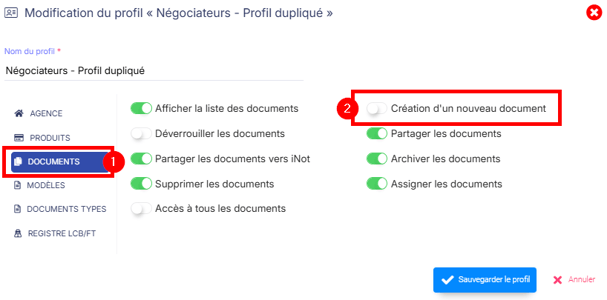 4. Dans la section Documents [1] : Mettre « Création d’un nouveau document » sur Non [2]. Cela empêche le collaborateur de créer ses propres modèles.