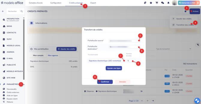 2. Cliquez sur le bouton Actions [3] > Transférer des crédits [4]