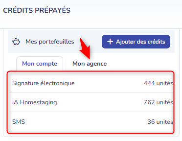 Vous pouvez visualiser le nombre d’unités de fonctionnalités restantes pour votre portefeuille ou pour chaque agence directement lors de la sélection des portefeuilles :